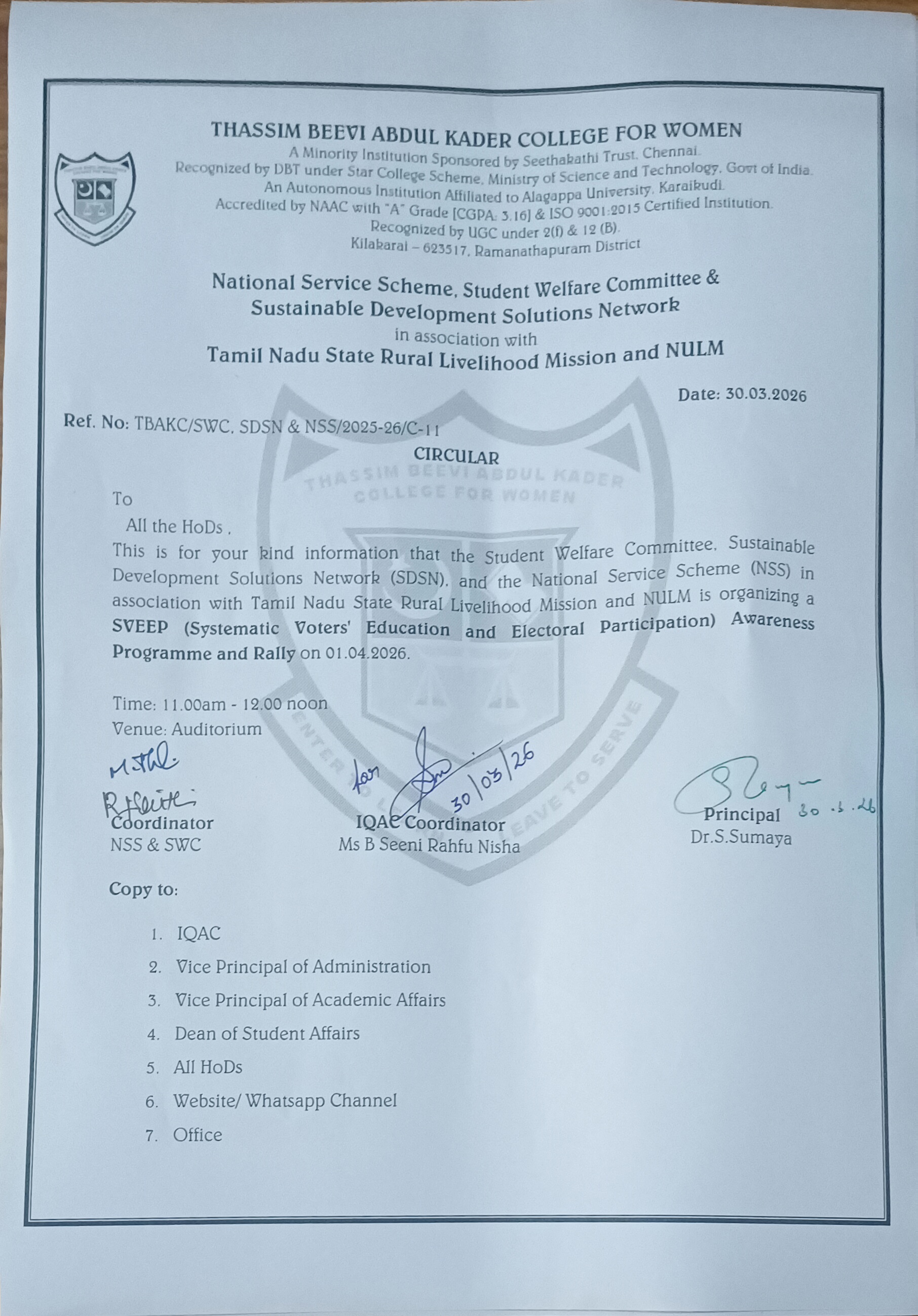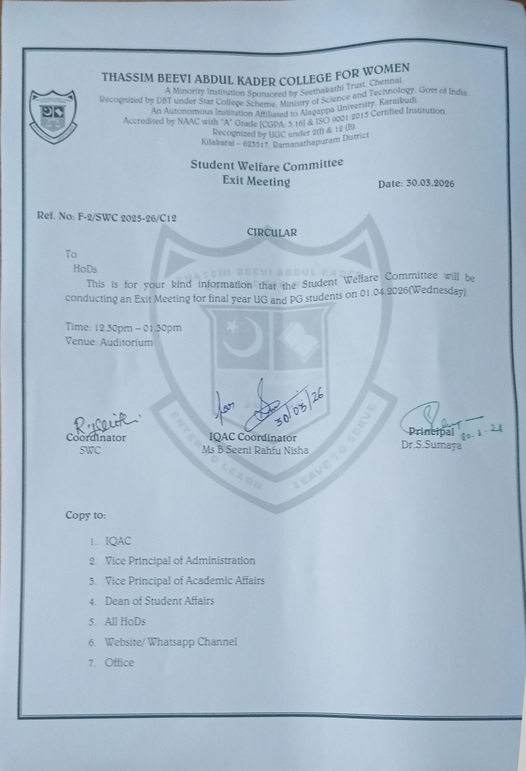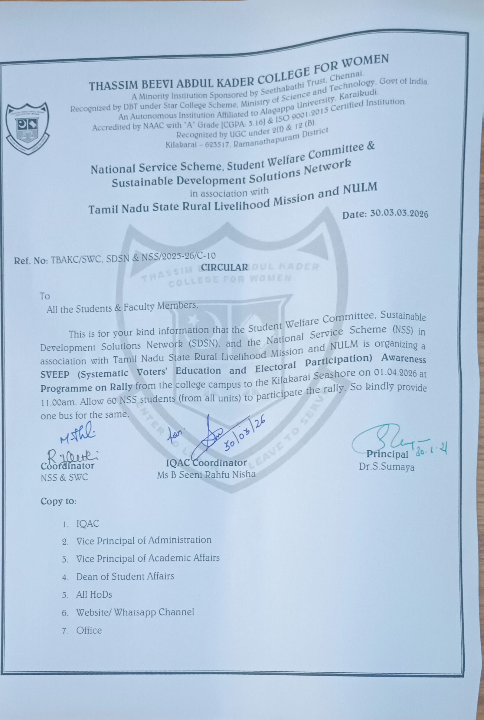 Thassim Beevi Abdul Kader College for Women was founded in 1988 by Alhaj Dr B S Abdur Rahman Sahib, sponsored by Seethakathi Trust, Chennai, which has established various educational institutions par excellence in Tamil Nadu.